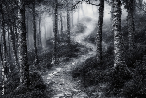 Naklejka premium Winding trail through a foggy forest captures the essence of tranquility and mystery in black and white