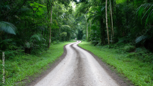 Fototapeta premium Winding trail through a lush exotic jungle surrounded by vibrant greenery and...