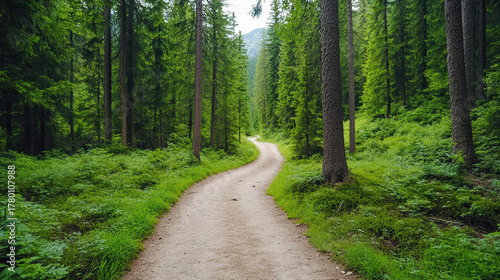 Naklejka premium Winding trail through tall pine forest, surrounded by lush greenery, creates...