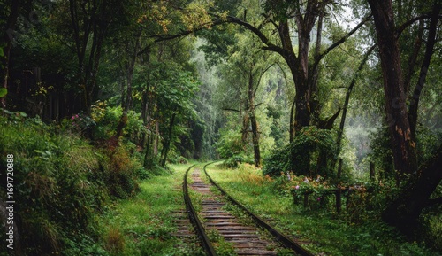 © afdal, Obraz premium Winding train tracks through a lush forest