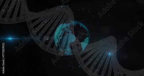 Fototapeta premium Winding wireframe DNA helix wrapping glowing Earth in digital space, with...