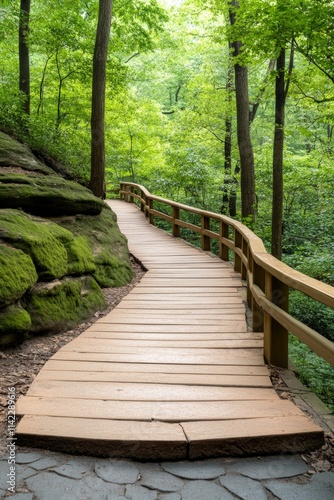 Obraz premium Winding wooden path through lush green forest inviting exploration and...