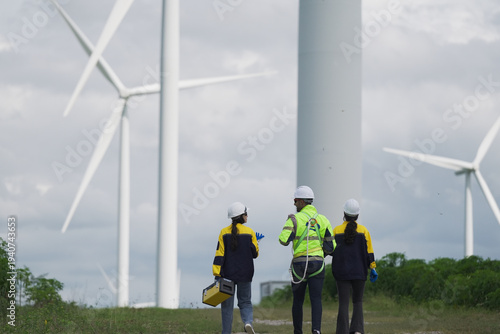 © Montri, Fototapeta premium Windmill engineers inspection and progress check wind turbine