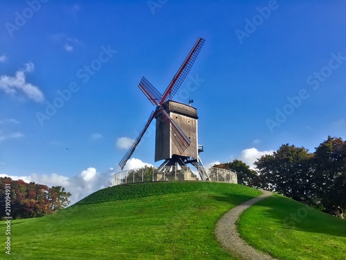Fototapeta premium Windmill on a hill on a sunny day on bruges belgium
