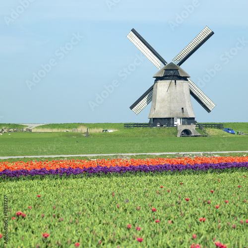 © Richard Semik, Naklejka premium windmill with tulip field near Schermerhorn, Netherlands