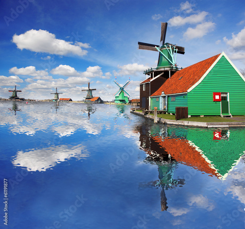 Obraz premium Windmills with canal in Zaanse Schans, Holland