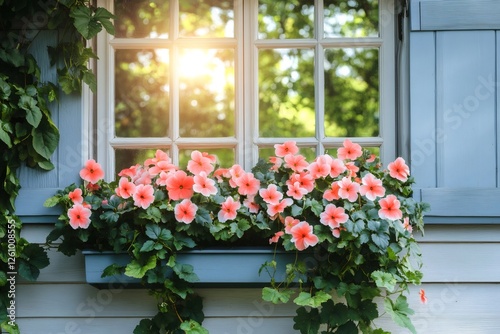 Fototapeta premium Window box bursting with vibrant pink flowers in sunlight