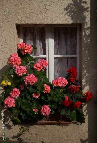 © Bob, Naklejka premium Window box with red and pink gerranium flowers, in the Swiss village of Lauterbrunnen