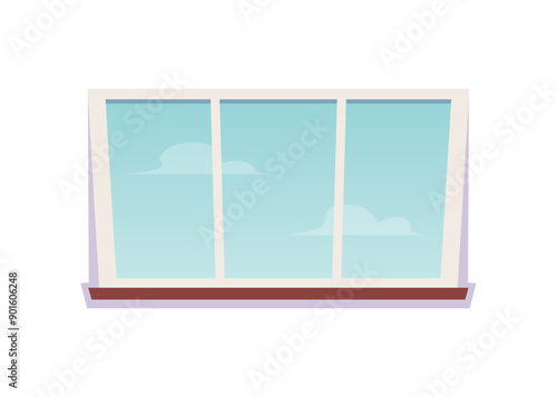 Fototapeta premium Window design icon, white frame with clean glass, wooden window sill, view of clear blue sky with clouds flat vector