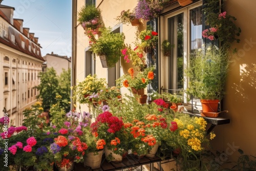 Fototapeta premium window garden filled with colorful flowers and herbs, on a sunny balcony,...