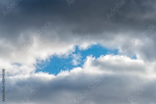 © Andrey Nikitin, Obraz premium Window of the clear blue sky among the clouds. Natural frame for creativity.