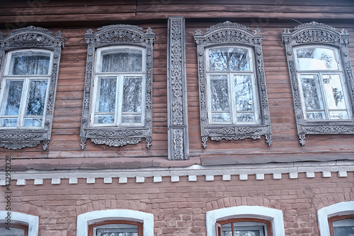 © kichigin19, Naklejka premium windows in an old wooden house, russian north architecture design