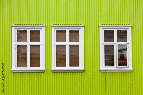 Fototapeta premium Windows on the bright green wall, Reykjavik, Iceland