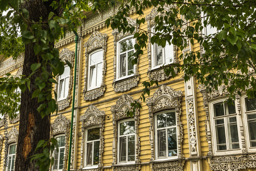 Fototapeta premium Windows with carved platbands of an old wooden house