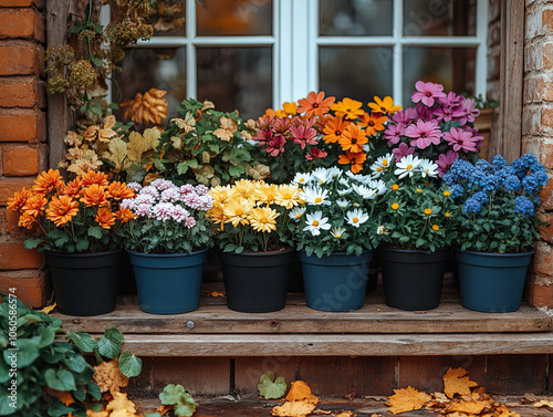 © Hilary, Fototapeta premium Windowsill of colorful potted mums