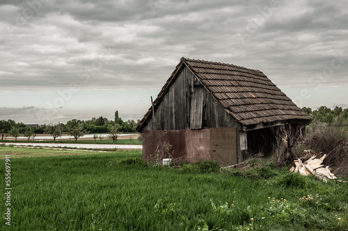 © lebaer, Obraz premium Windschiefe Hütte auf Wiese oder Bauplatz