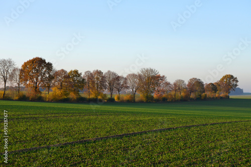 © Peter Oetelshofen, Naklejka premium Windschutzstreifen, Felder. Ein schmaler Windschutzstreifen mit hohen Bäumen, Hochsitz, Sträuchern, Hecken, Gebüschen, Feldgehölzen, Feldhecken