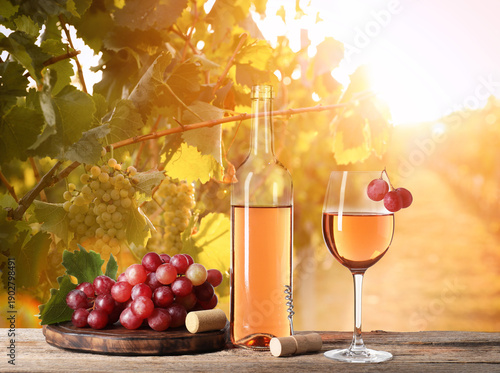 © New Africa, Fototapeta premium Wine and fresh grapes on table. Glass and bottle in sunny vineyard