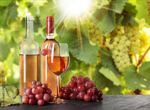 Naklejka premium Wine and fresh grapes on table. Glass and bottles in vineyard