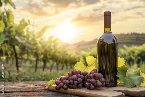 Fototapeta premium Wine bottle and fresh grapes , vineyard in background, mockup boards. Generative AI