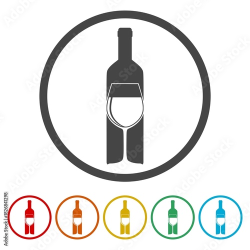 Fototapeta premium Wine bottle and glass icon. Set icons in color circle buttons