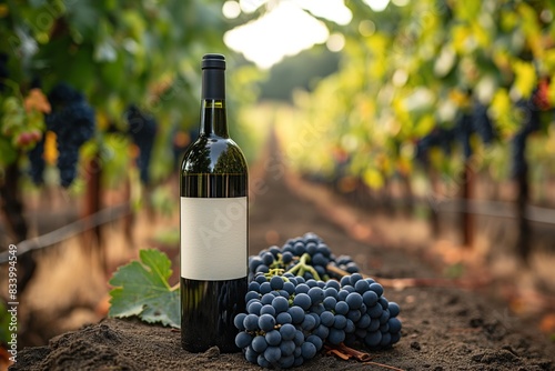 Fototapeta premium Wine bottle and grapes in vineyard at sunset