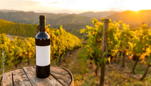 © Bhir, Fototapeta premium Wine bottle at sunset in a vineyard, a rustic scene of tuscan countryside charm