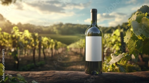 Fototapeta premium Wine Bottle on Wooden Log with Vineyard Background.