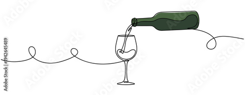 Fototapeta premium Wine bottle pouring into glass over continuous line border
