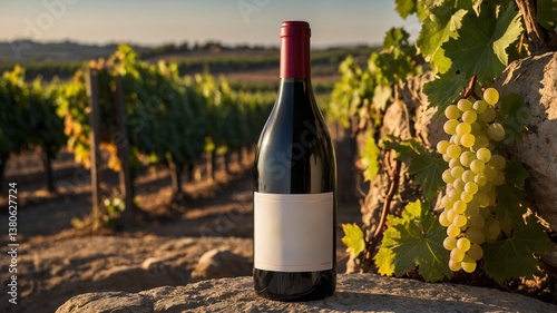 Fototapeta premium Wine bottle resting on rocky surface amidst vineyard at sunset
