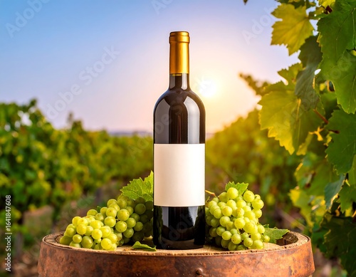 © Hilya, Fototapeta premium Wine bottle with blank label, rests on wooden barrel amongst green grapes at sunset