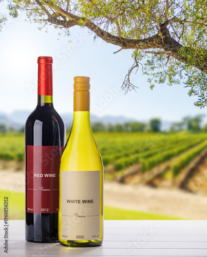 © evgeeenius, Fototapeta premium Wine bottles mockup in sunlit vineyard
