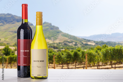 © evgeeenius, Fototapeta premium Wine bottles mockup in sunlit vineyard