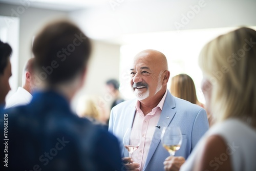 © altitudevisual, Obraz premium wine expert discussing with guests at a wine tasting event, wine glasses in the frame