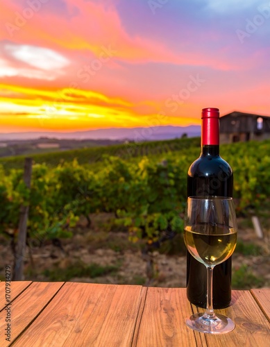Fototapeta premium Wine glass and bottle at sunset over vineyards
