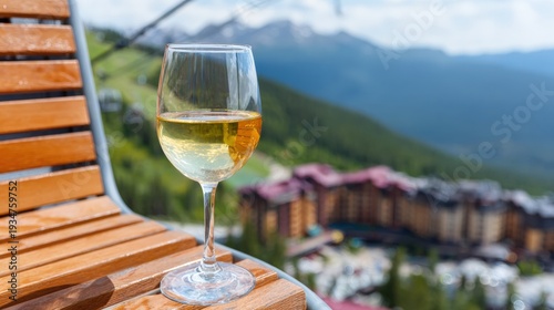 © OleksandrZastrozhnov, Naklejka premium Wine glass outdoors on mountain view balcony overlooking scenic landscape