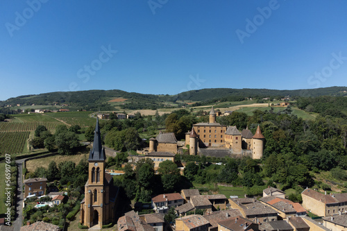 © barmalini, Fototapeta premium Wine making region Beaujolais Pierre dorees wioth yellow houses and hilly vineyards, aerial view, France