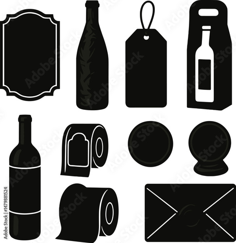 Fototapeta premium Wine packaging icons set – silhouette, beverage and bottle design symbols