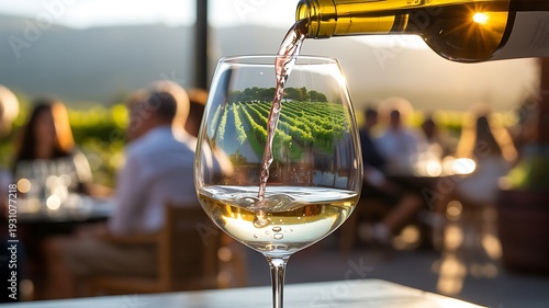 © Trendy Motion, Fototapeta premium Wine pouring glass vineyard reflection sunset