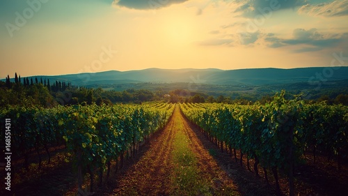 © Cyqueen, Fototapeta premium Wine theme hospitality background: golden hour vineyard aerial beauty, warm sunset light neat rows, soft distant hills effect