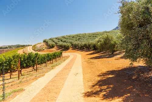Fototapeta premium Winery road between vineyards and olive grove
