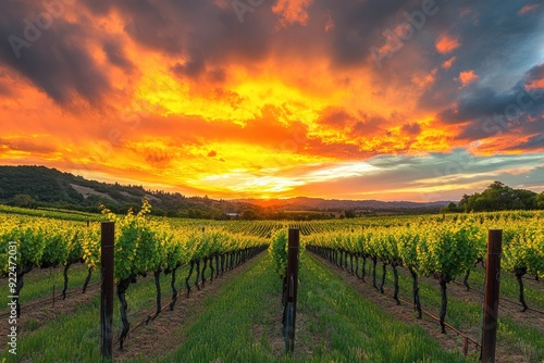 Fototapeta premium Winery Sonoma. Dramatic and Colorful Sunset Over Vineyard with Vibrant Orange...