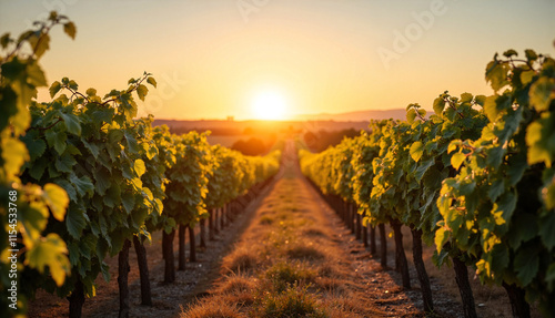 © Yury, Naklejka premium Winery Vineyard Rows at Sunset in Golden Hour Lighting with Serene Ambiance