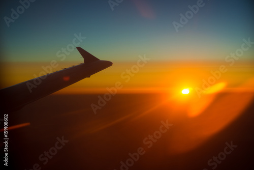 © Yarkovoy, Fototapeta premium Wing of a Airplane at sunset with clouds