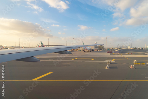 © tampatra, Fototapeta premium Wing of an airplane jet flying and landing with buildings view in urban city from window at runway in the airport. Traveling and transportation concept.