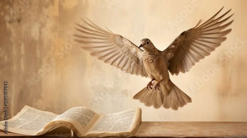 © sorin, Obraz premium Winged dove symbolizing the holy spirit from the new testament with ample copy space