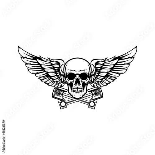 Obraz premium Winged skull with crossed pistons. Design element for emblem, sign, badge, logo. Vector illustration