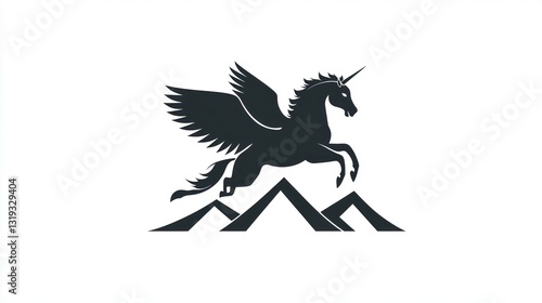 © Mufarokah, Obraz premium Winged unicorn soaring over mountains, logo design