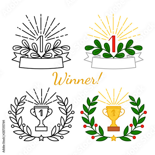 Fototapeta premium Winner awards with ribbons, wreath, goblet vector set. Number one banners design