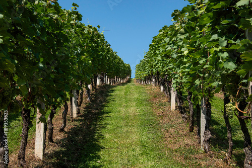Naklejka premium Winorośle w równych rzędach na winnicy w słoneczny dzień z błękitnym niebem w...